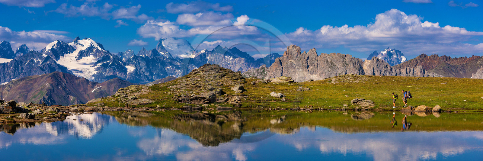 | Description | Hautes-Alpes (05), Briançonnais, Vallée de la Clarée, site naturel classé, Névache, randonnée pédestre aux Lacs des Gardioles, le massif des Ecrins et la Barre des Ecrins |