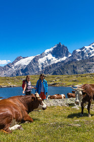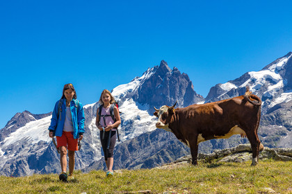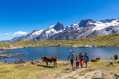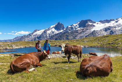 • Hautes-Alpes (05), La Grave, Serre Chevalier, Parc national des Ecrins, plateau d'Emparis, randonnée pédestre avec Alexandre Puech, accompagnateur en moyenne montagne avec Bureau Montagne Horizons La Grave Serre Chevalier, avec les vaches en alpage // Hautes-Alpes (05), La Grave, Serre Chevalier, Ecrins National Park, Emparis plateau, hiking with Alexandre Puech, mountain guide with Horizons Mountain Bureau La Grave Serre Chevalier