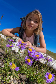 • Hautes-Alpes (05), La Grave, Serre Chevalier, Parc national des Ecrins, plateau d'Emparis, randonnée pédestre avec Alexandre Puech, accompagnateur en moyenne montagne avec Bureau Montagne Horizons La Grave Serre Chevalier, observation d'une aster des alpes à la loupe // Hautes-Alpes (05), La Grave, Serre Chevalier, Ecrins National Park, Emparis plateau, hiking with Alexandre Puech, mountain guide with Horizons Mountain Bureau La Grave Serre Chevalier