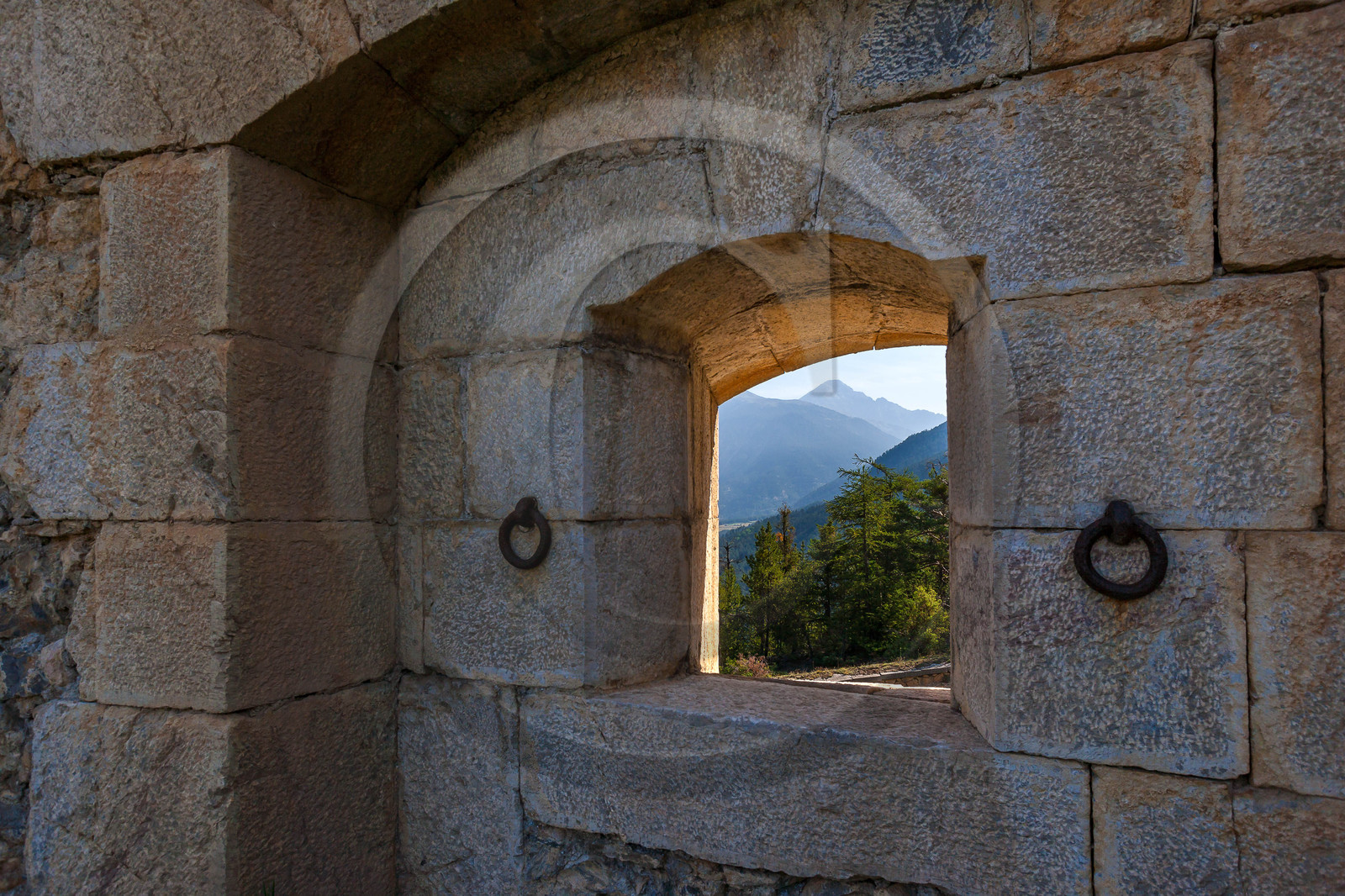 | Description | Hautes-Alpes (05), Serre Chevalier Vallée Briançon, 1350m d'altitude, ville d'Art et d'Histoire fortifiée par Vauban, les fortifications de Vauban sont inscrites sur la liste du patrimoine mondial de l'UNESCO, Briançon, Fort Dauphin, fenêtre sur le col de Montgenèvre |