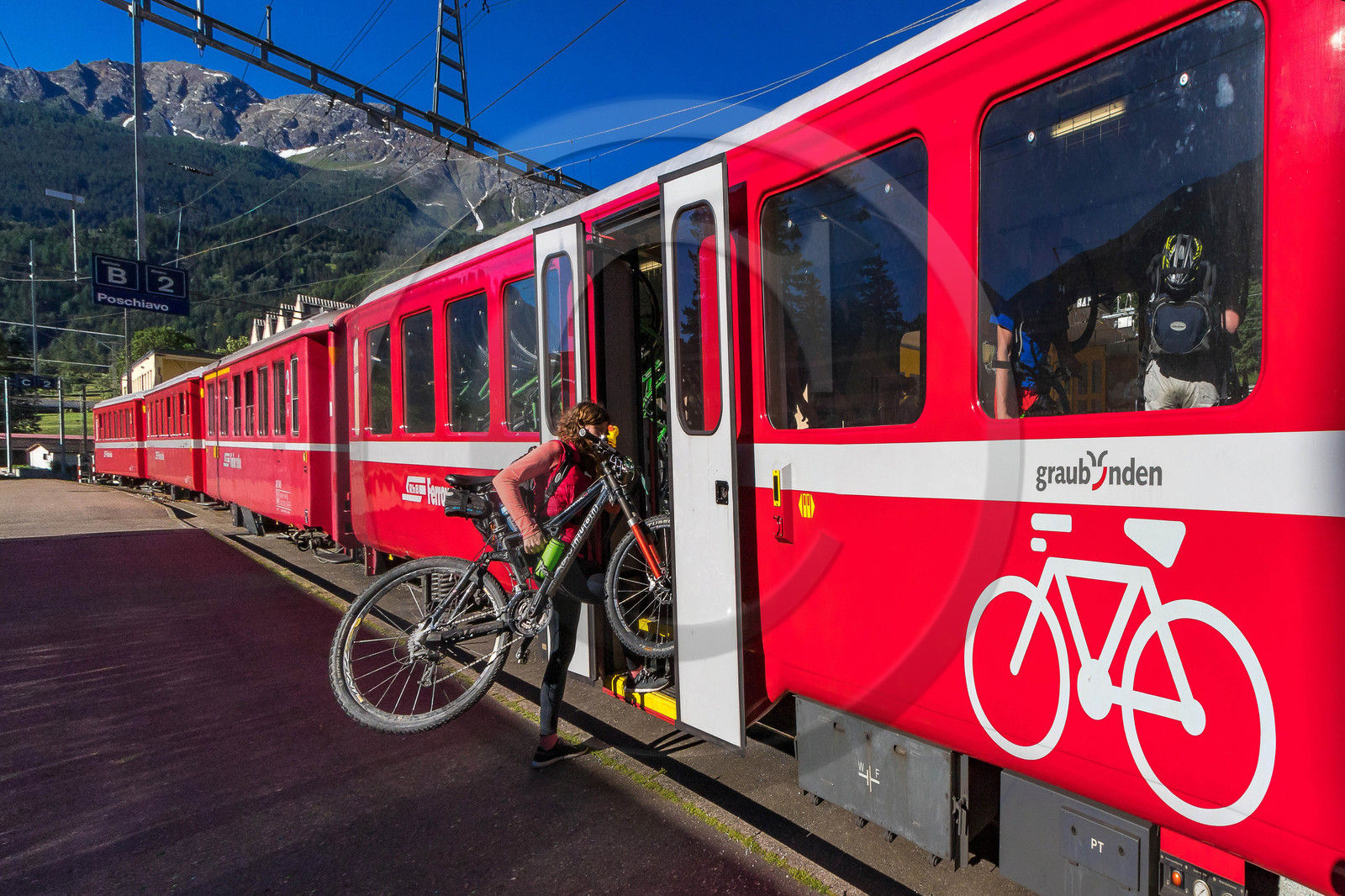 | Description | Suisse, canton des Grisons, Chemins de fer rhétiques, traversée des Alpes à bord du Bernina Express, itinéraire inscrit au patrimoine mondial de l'UNESCO, Poschiavo, un des Plus Beaux Villages de Suisse, le wagon à vélos |