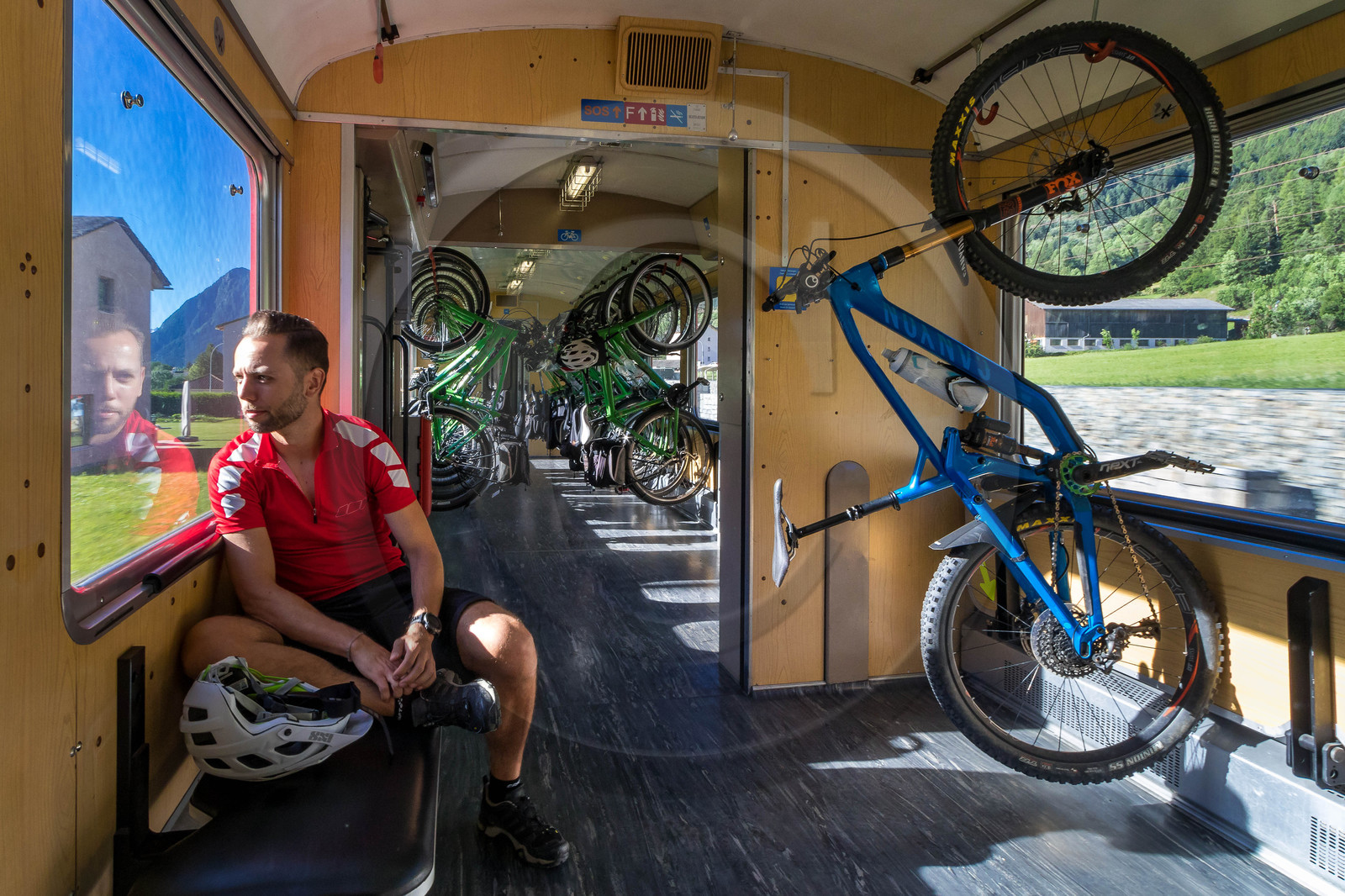 | Description | Suisse, canton des Grisons, Chemins de fer rhétiques, traversée des Alpes à bord du Bernina Express, itinéraire inscrit au patrimoine mondial de l'UNESCO, Poschiavo, un des Plus Beaux Villages de Suisse, le wagon à vélos |