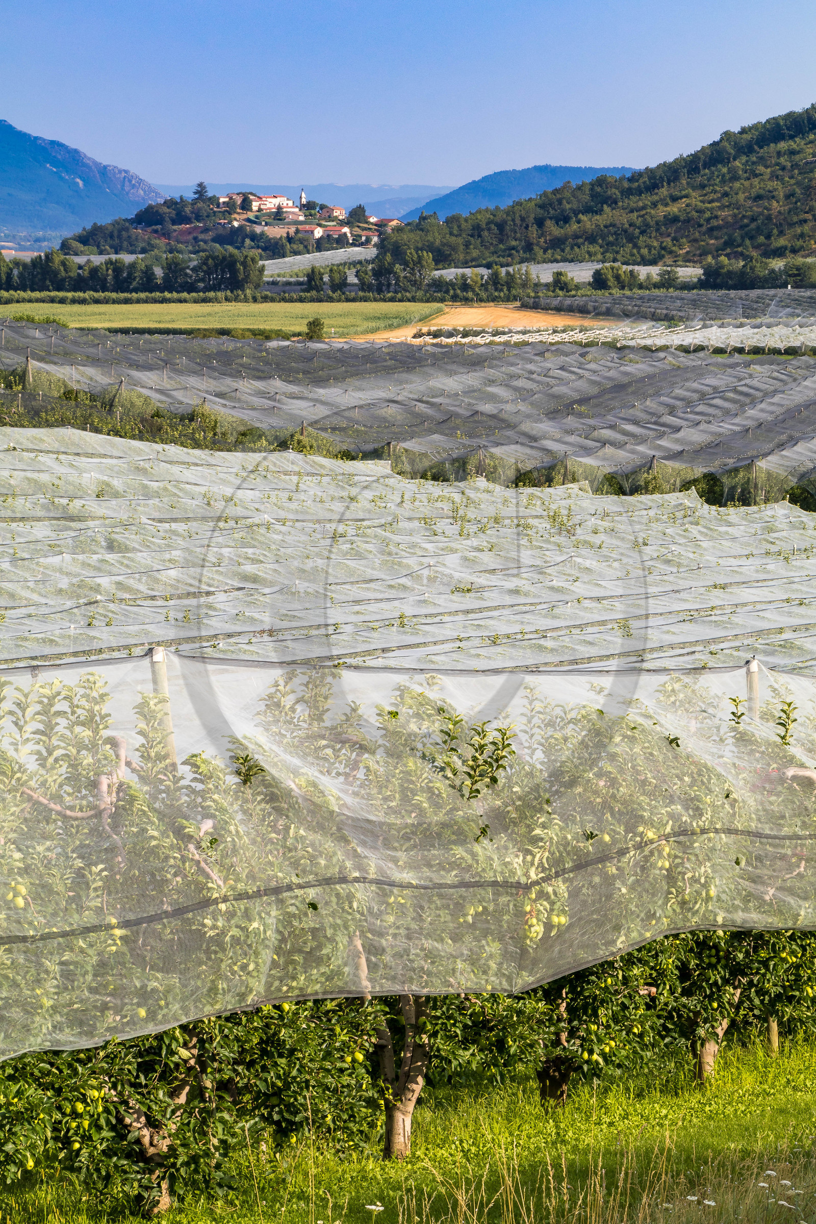 | Description | Hautes-Alpes (05), vallée de la Durance, Pays du Buech, commune sur l'ancien tracé de la route Napoléon, Le Poët, arboriculture |