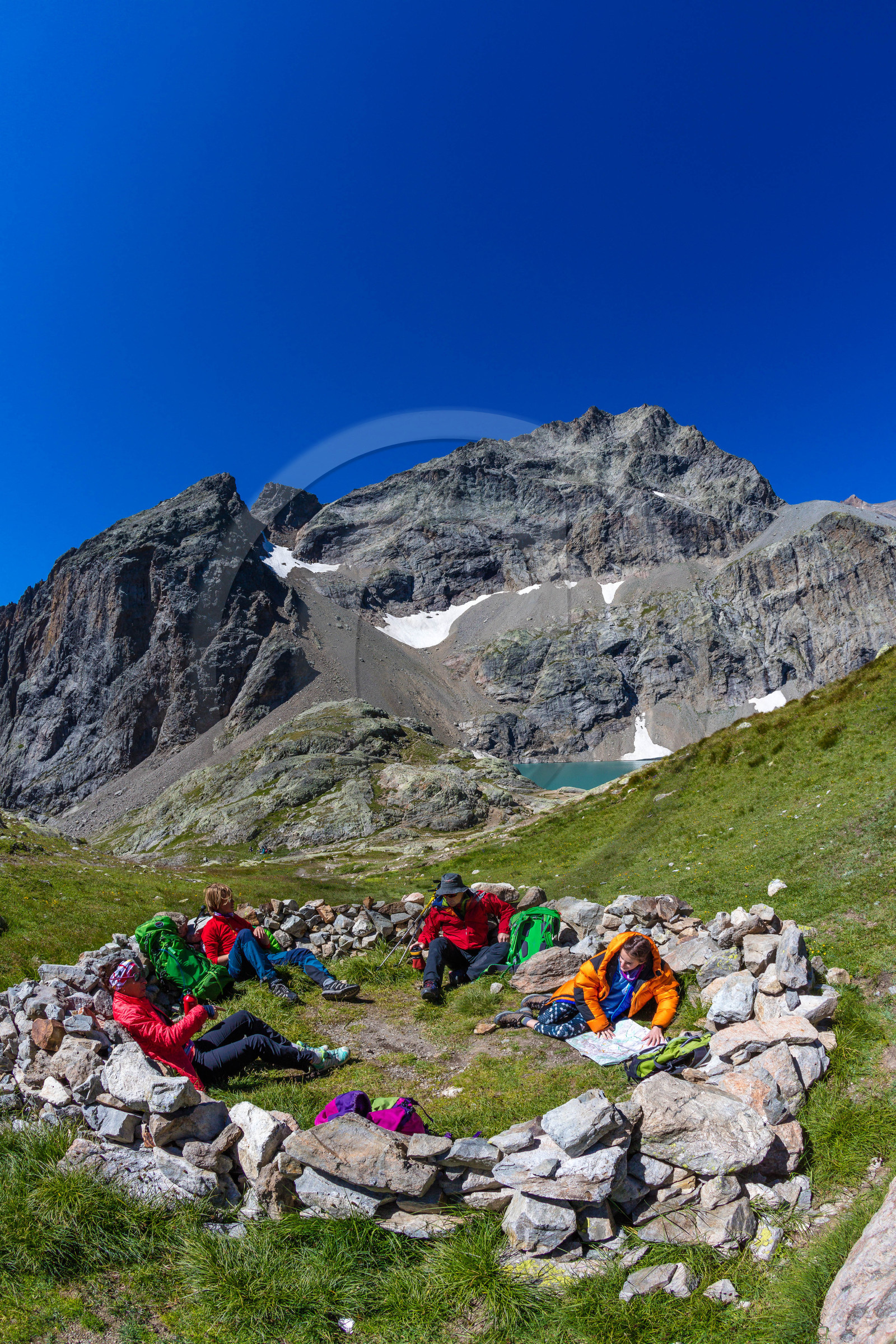 | Description | Hautes-Alpes (05), Pays des Ecrins, Parc national des Ecrins, Pelvoux-Vallouise, GR 54, Grand tour des Ecrins, Lac de L'Eychauda |