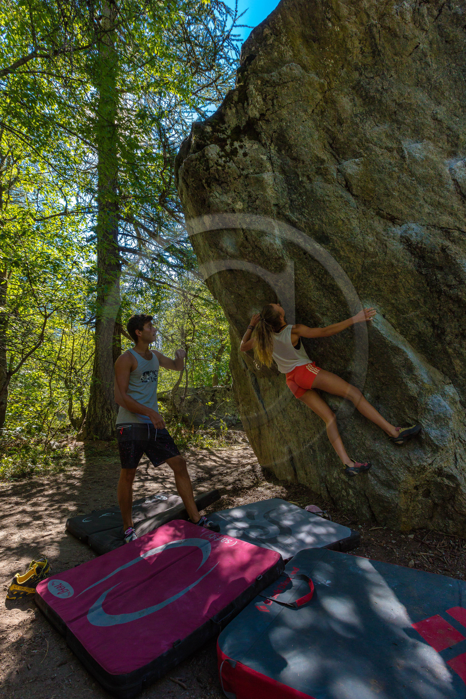 | Description | Hautes-Alpes (05), Pays des Ecrins, Parc national des Ecrins, Pelvoux-Vallouise, Ailefroide, site d'escalade de blocs, Emilie et Quentin sur "champignon" |
