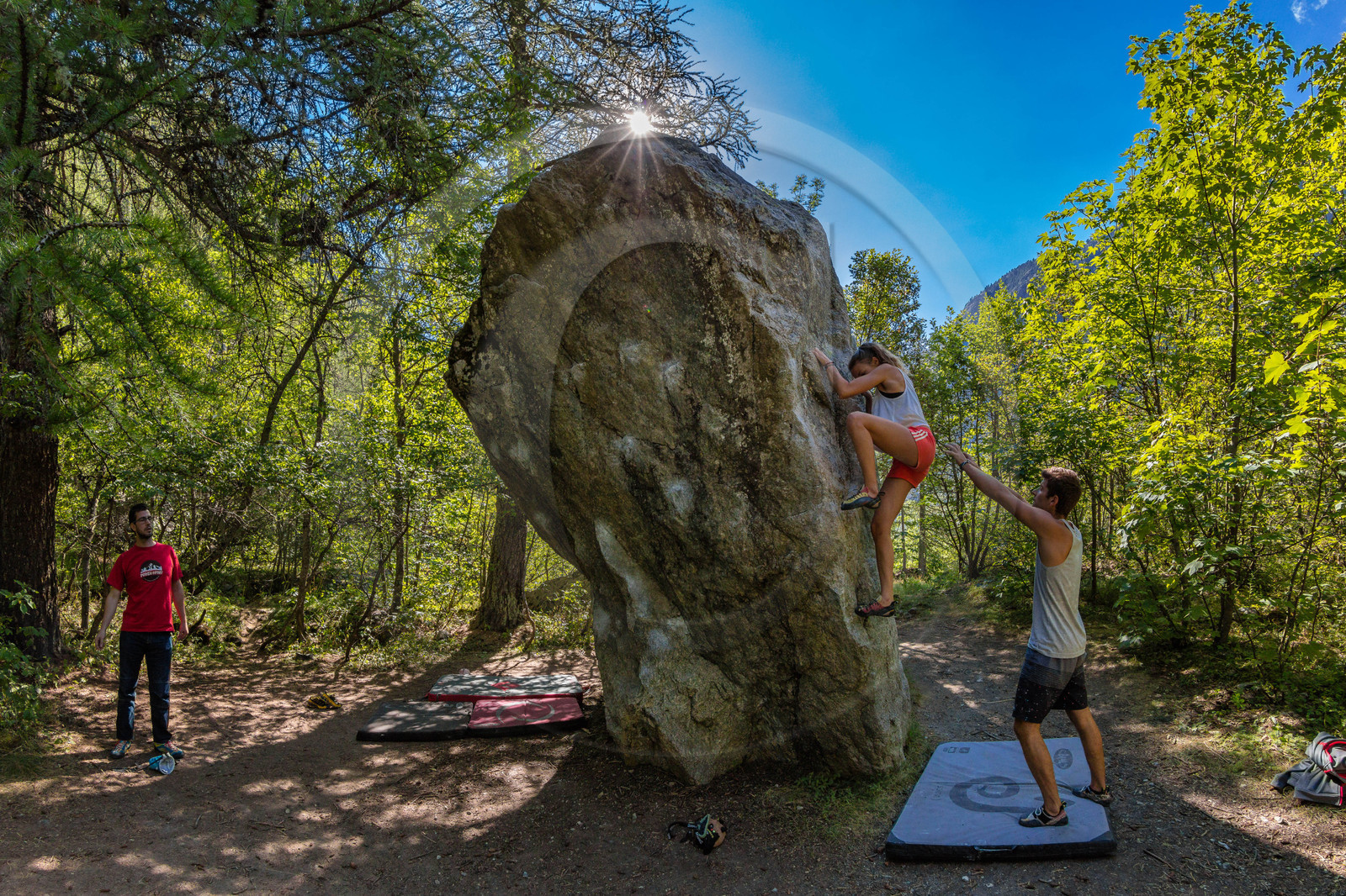| Description | Hautes-Alpes (05), Pays des Ecrins, Parc national des Ecrins, Pelvoux-Vallouise, Ailefroide, site d'escalade de blocs, Emilie et Quentin sur "champignon" |