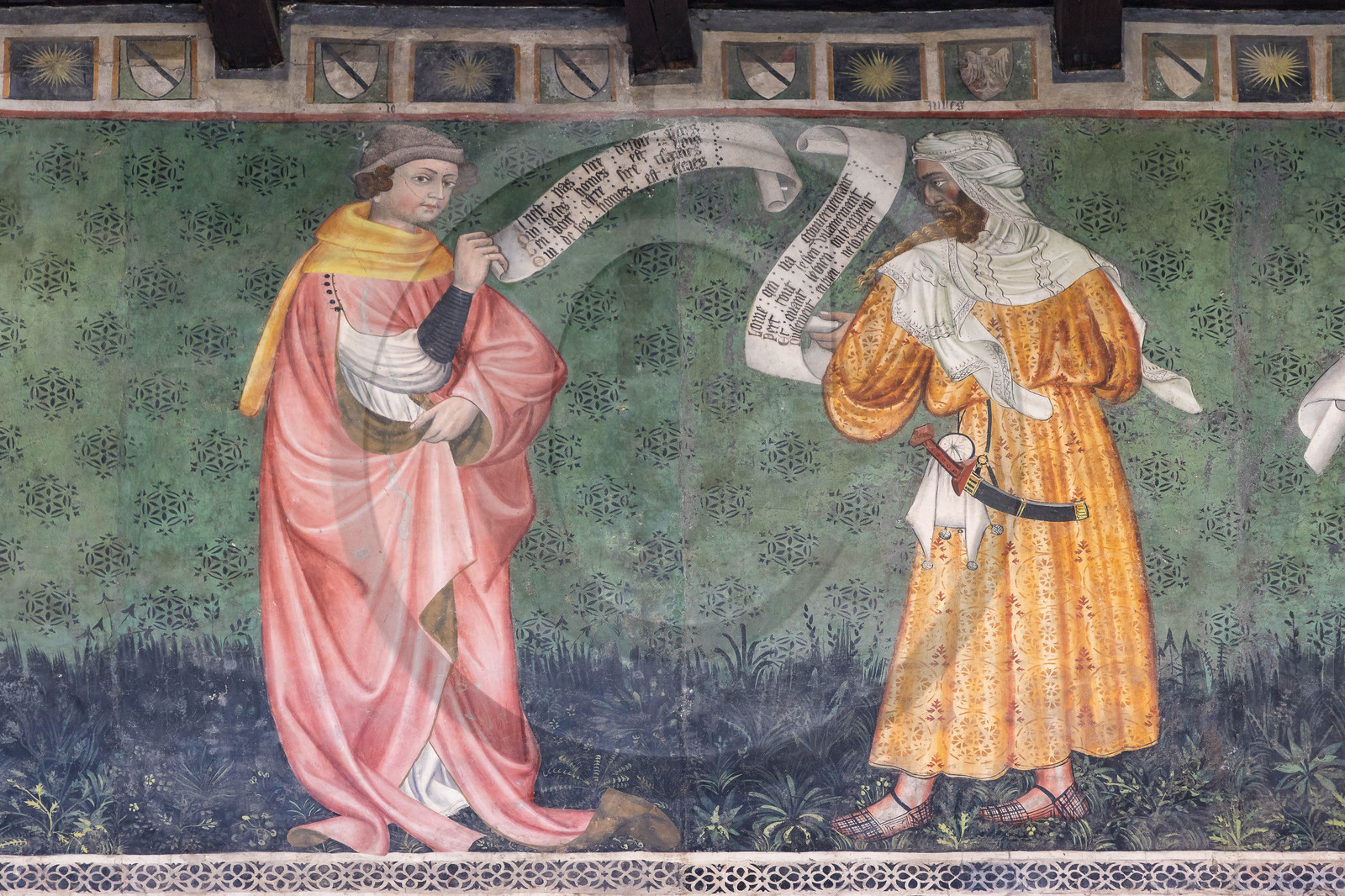 | Description | Italie, vallée d'Aoste, Aoste, Fénis, Château de Fénis, fresques représentant des sages et des philosophes de l'Antiquité, chacun avec un parchemin écrit de proverbes et de maximes en ancien français |