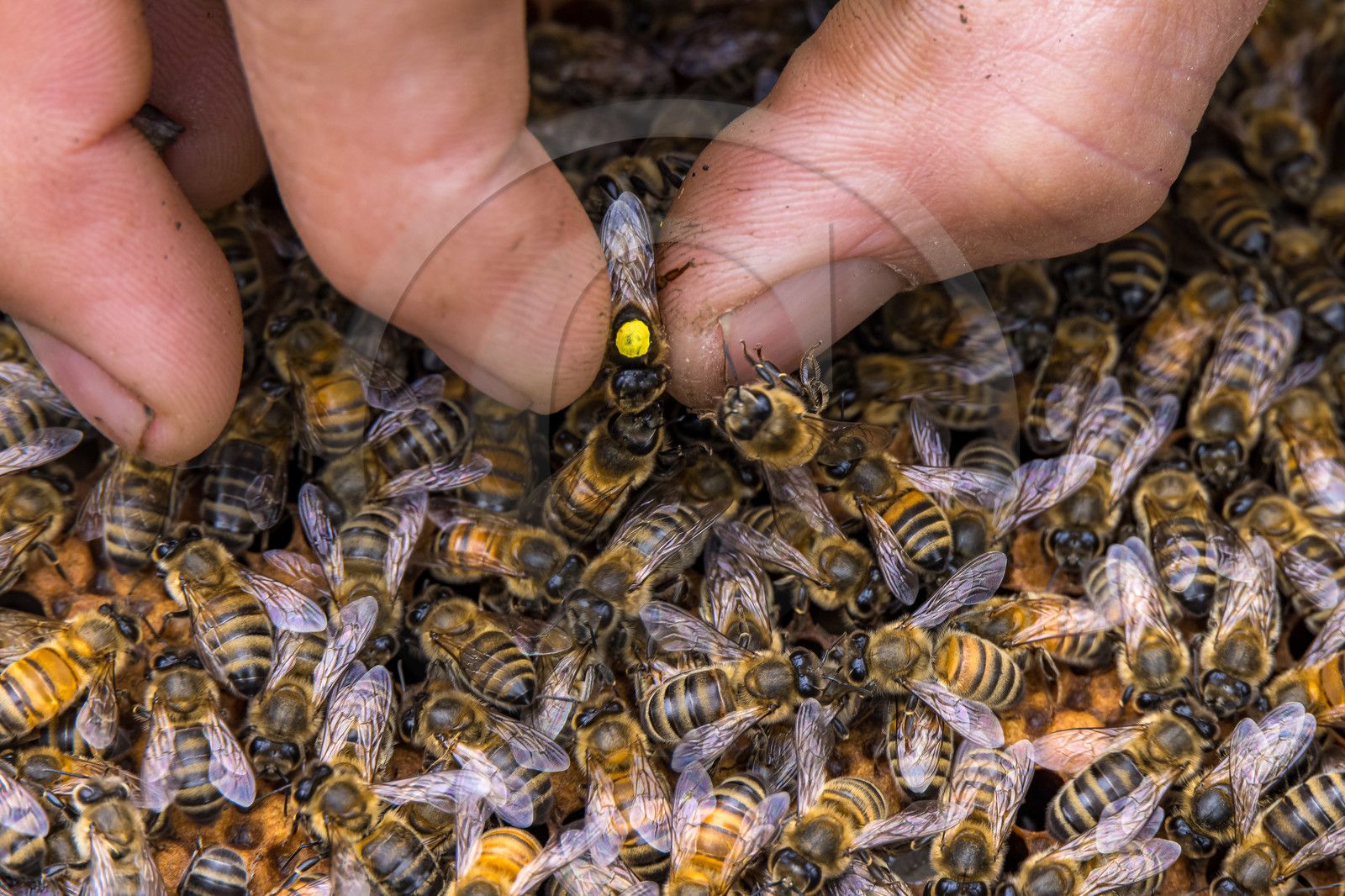 | Description | Hautes-Alpes (05), L'Argentière-la-Bessée, Parc national des Ecrins, Esprit parc national, Rucher du Chardon Bleu, Franck Violin, apiculteur, miel de montagne, abeille, marquage de la reine |