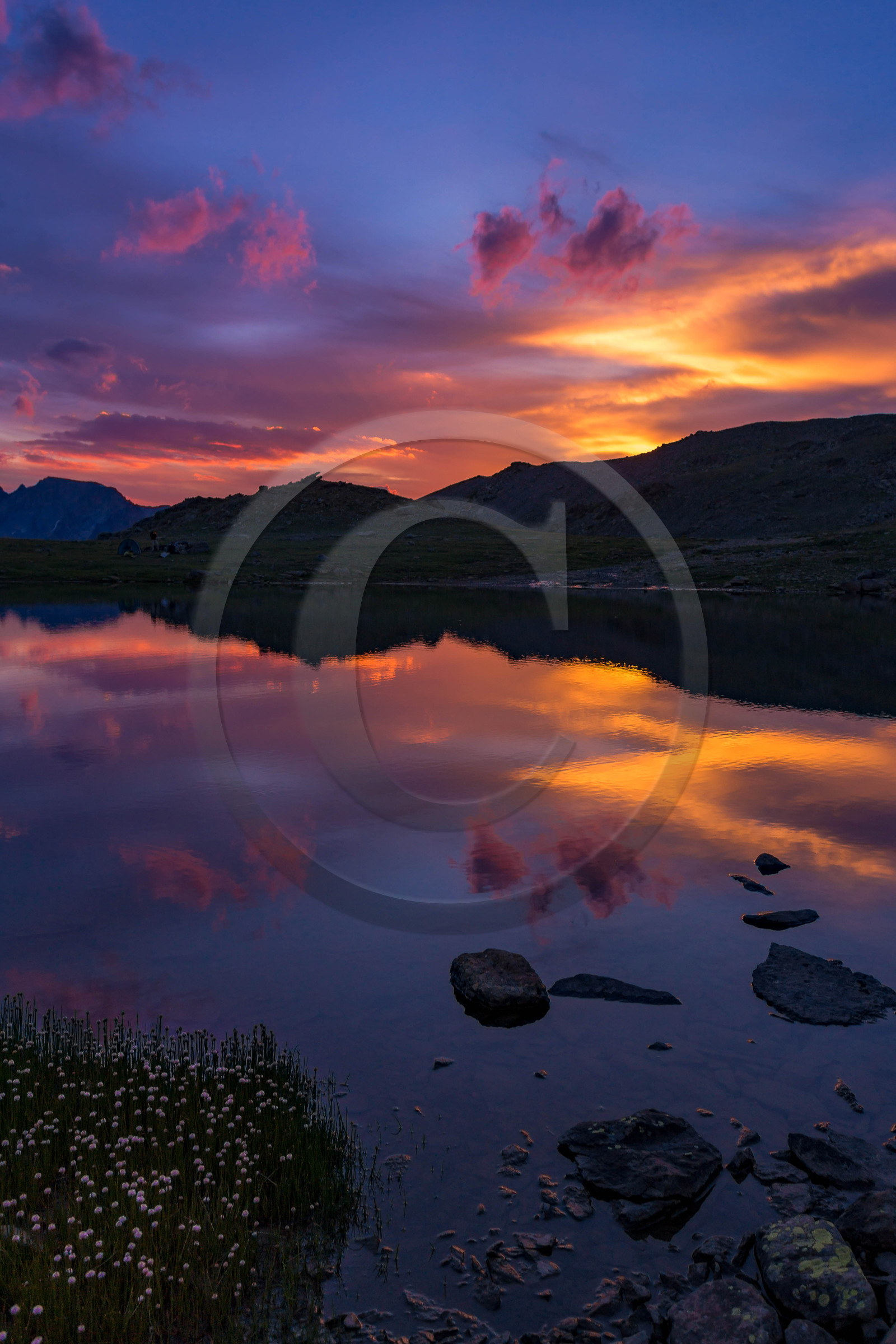 Description | Hautes-Alpes (05), Briançonnais, Vallée de la Clarée, site naturel classé, Névache, crépuscule aux Lacs des Gardioles |