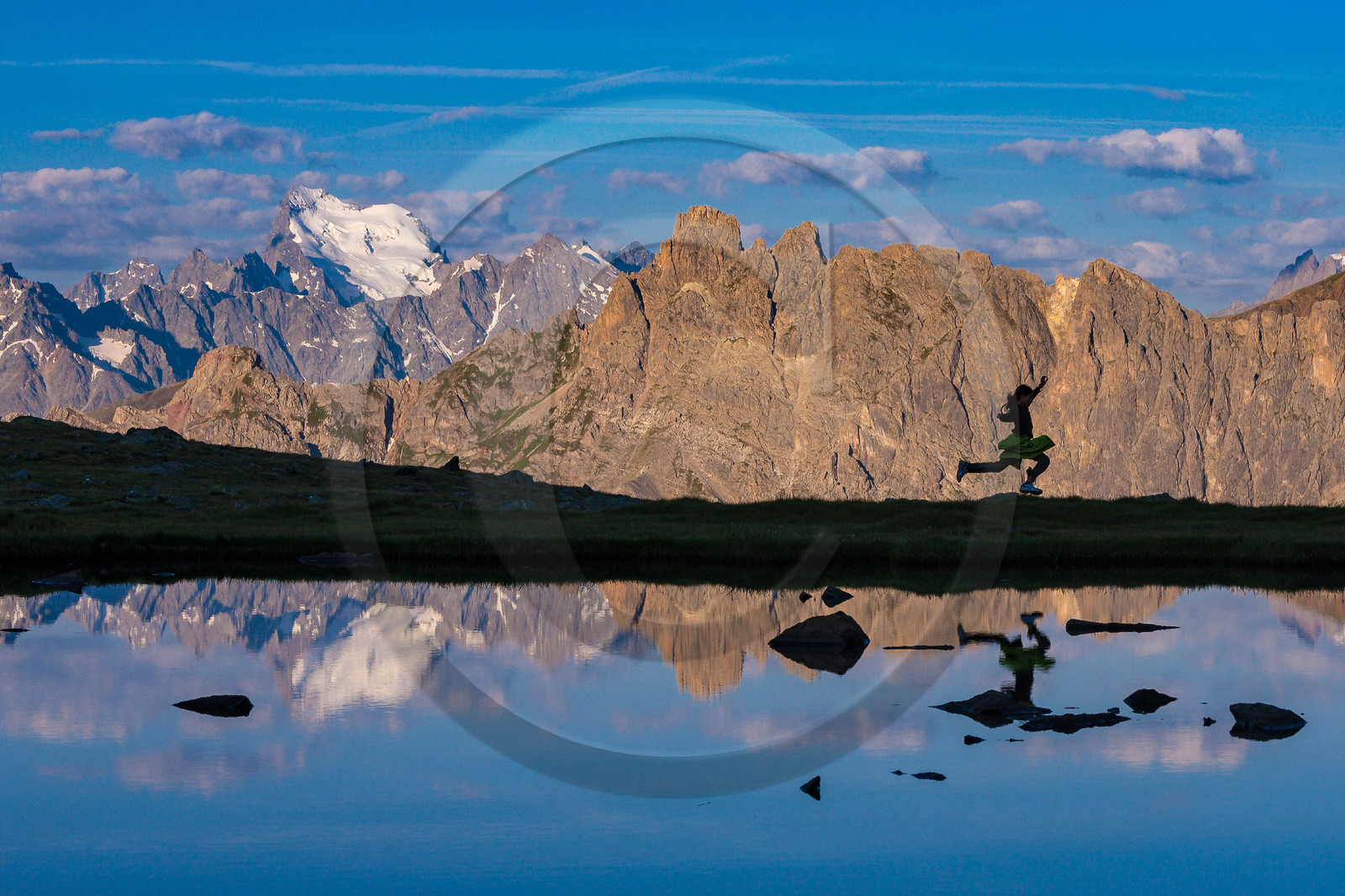 Description | Hautes-Alpes (05), Briançonnais, Vallée de la Clarée, site naturel classé, Névache, randonnée pédestre et lever de soleil aux Lacs des Gardioles, au fond, la Barre des Ecrins |