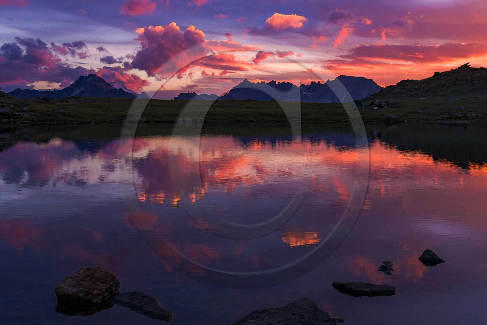 Description | Hautes-Alpes (05), Briançonnais, Vallée de la Clarée, site naturel classé, Névache, crépuscule aux Lacs des Gardioles |