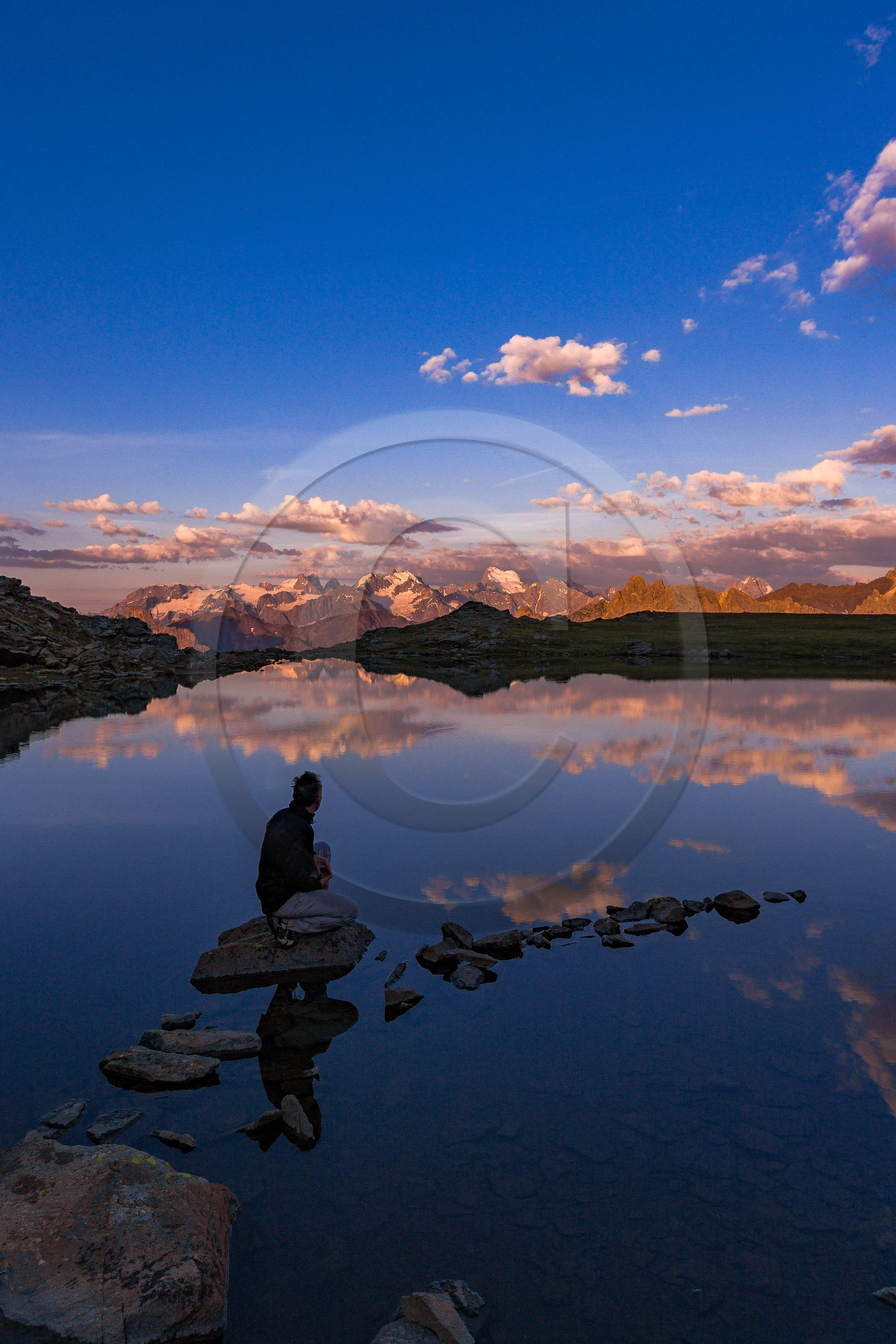| Description | Hautes-Alpes (05), Briançonnais, Vallée de la Clarée, site naturel classé, Névache, randonnée pédestre et lever de soleil aux Lacs des Gardioles, au fond, le massif des Ecrins |