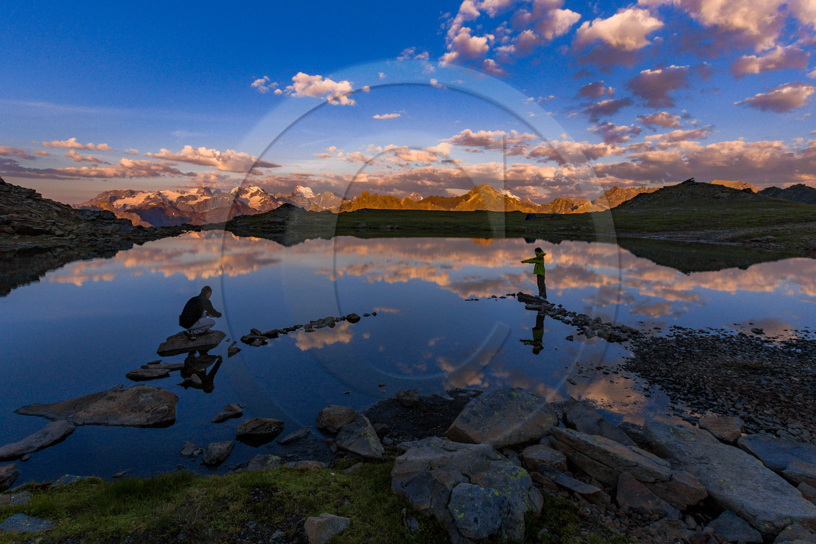 Description | Hautes-Alpes (05), Briançonnais, Vallée de la Clarée, site naturel classé, Névache, randonnée pédestre et lever de soleil aux Lacs des Gardioles, au fond, le massif des Ecrins |