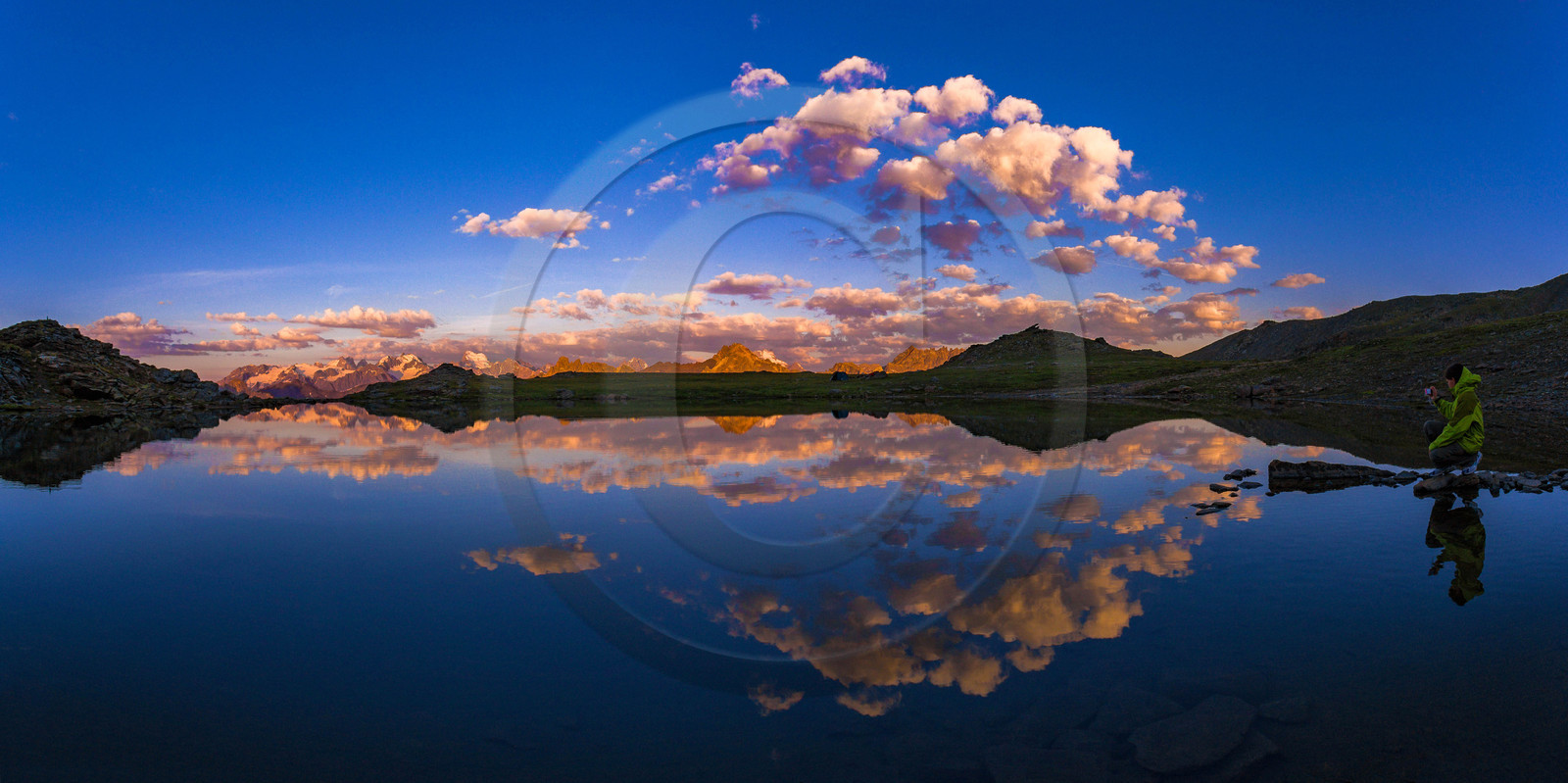 | Description | Hautes-Alpes (05), Briançonnais, Vallée de la Clarée, site naturel classé, Névache, randonnée pédestre et lever de soleil aux Lacs des Gardioles, au fond, le massif des Ecrins |