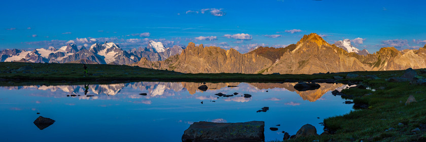 Hautes-Alpes (05), Briançonnais, Vallée de la Clarée, site naturel classé, Névache, randonnée pédestre et lever de soleil aux Lacs des Gardioles, au fond, le massif des Ecrins, la Barre des Ecrins et la Meije