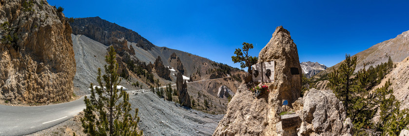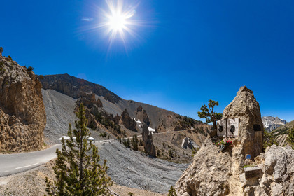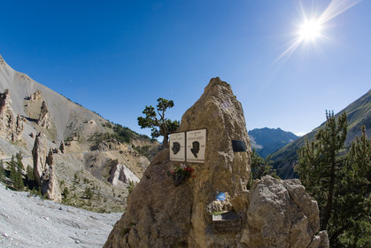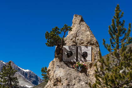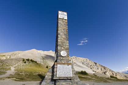 Hautes-Alpes (05), Parc naturel régional du Queyras, Le col de l'Izoard fait partie des cols légendaires depuis longtemps fréquentés par le Tour de France, la Casse Déserte, stèle Fausto Coppi et Louison Bobet // Hautes-Alpes (05), Regional Natural Park of Queyras, The Col of Izoard one of the legendary mountain passes long frequented by the Tour de France, la Casse Déserte, Fausto Coppi and Louison Bobet