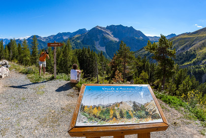 Hautes-Alpes (05), Guillestrois, Domaine de la Forêt Blanche, Station de ski de Risoul, alpage de Chérines, Belvédère de L'Homme de Pierre avec vue sur le Lac de Serre-Ponçon, table d'orientation // Hautes-Alpes (05), Domaine de la Forêt Blanche, Risoul ski resort