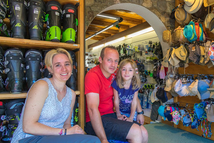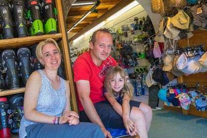 Hautes-Alpes (05), Parc naturel régional du Queyras, Ceillac, Stéphanie et Romain Etienne, propiétaires du magasin de sport Skiset // Hautes-Alpes (05), Queyras Regional Natural Park, Ceillac, Stéphanie and Romain Etienne, owners of the Skiset sports store