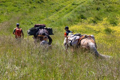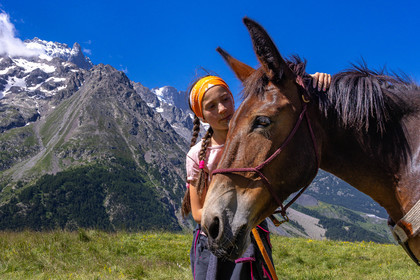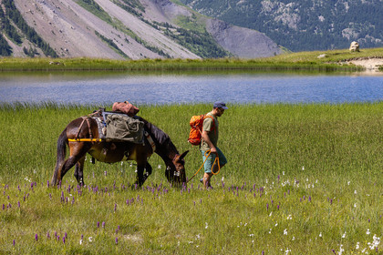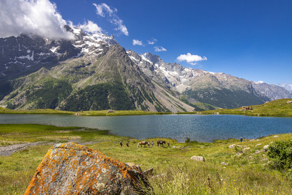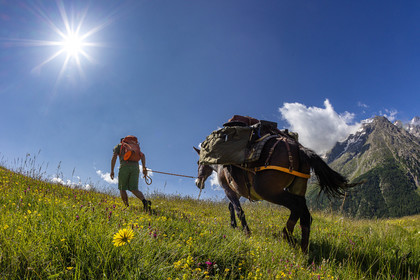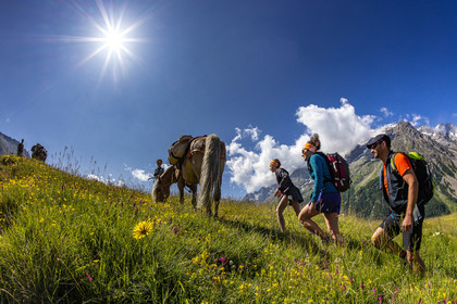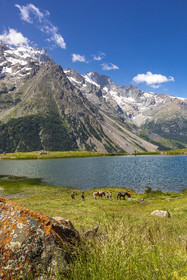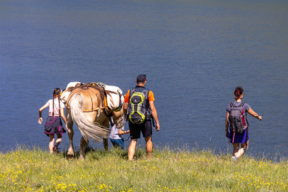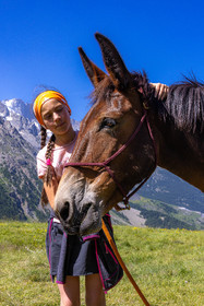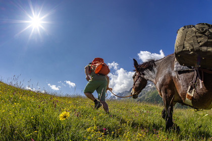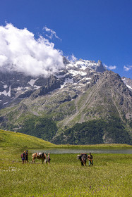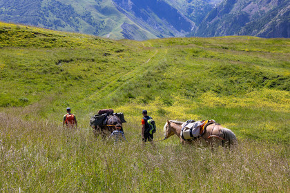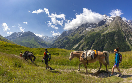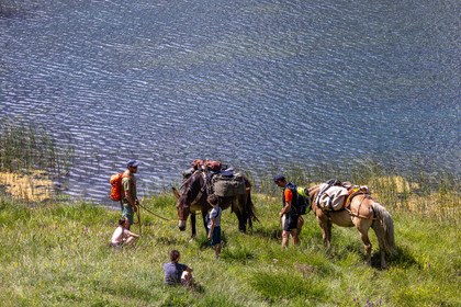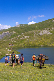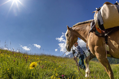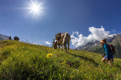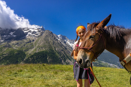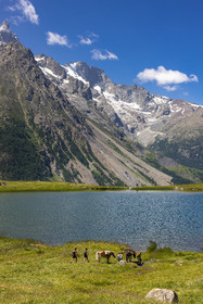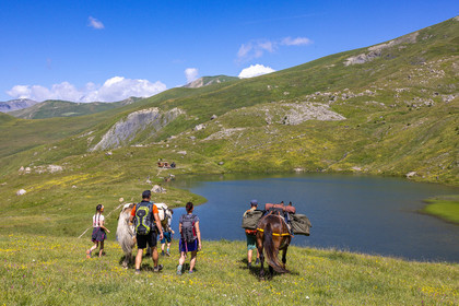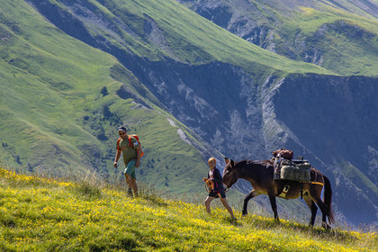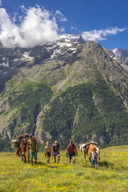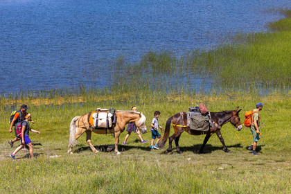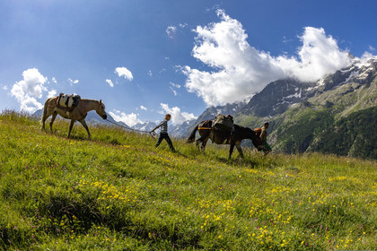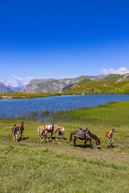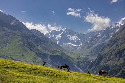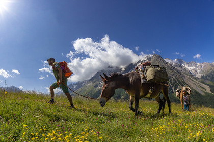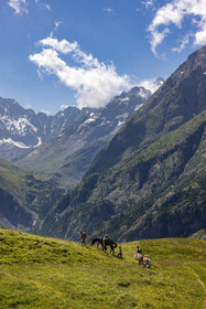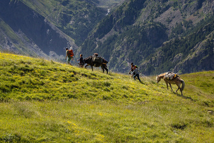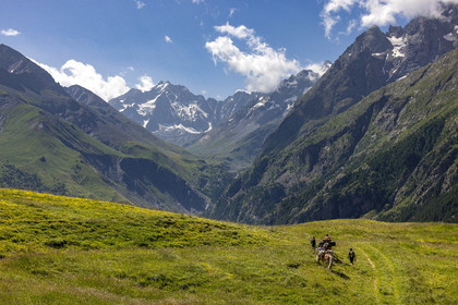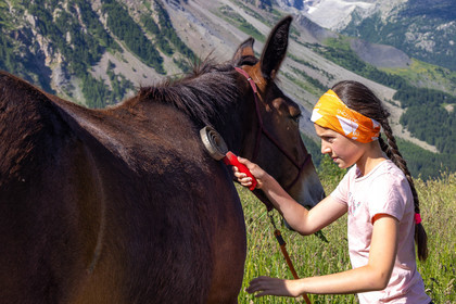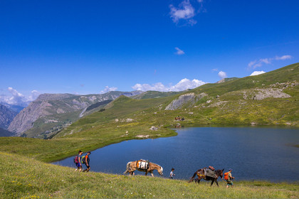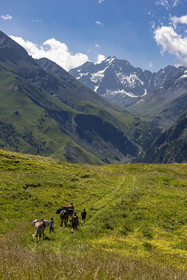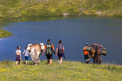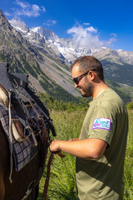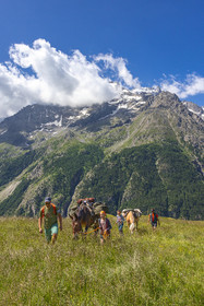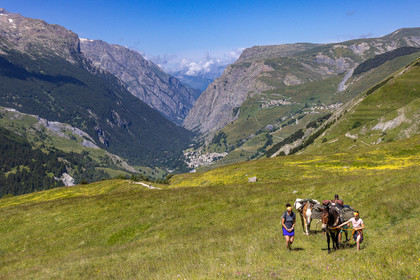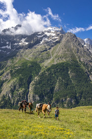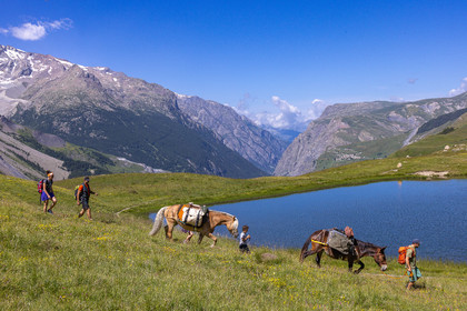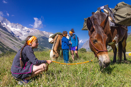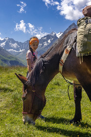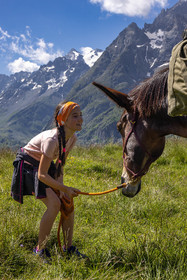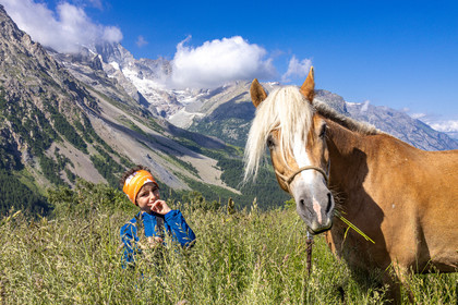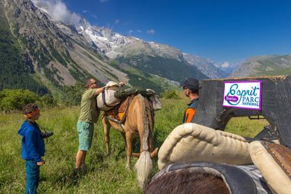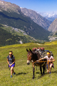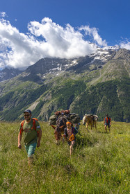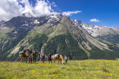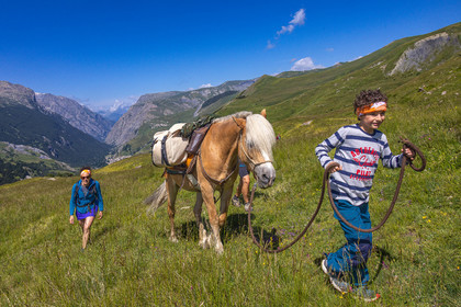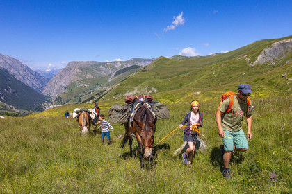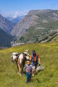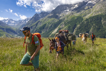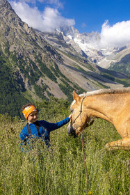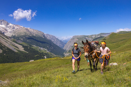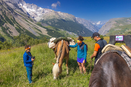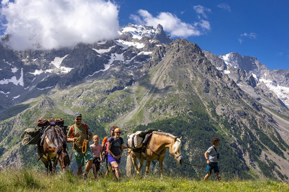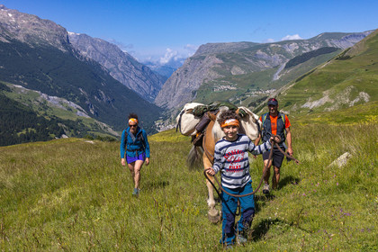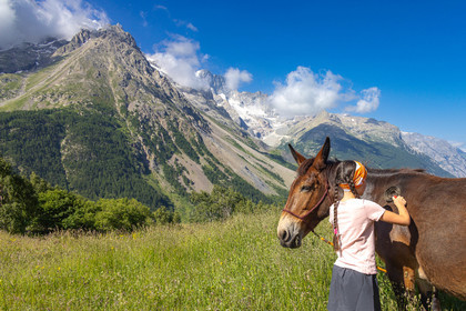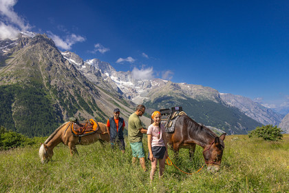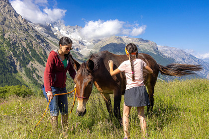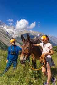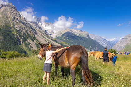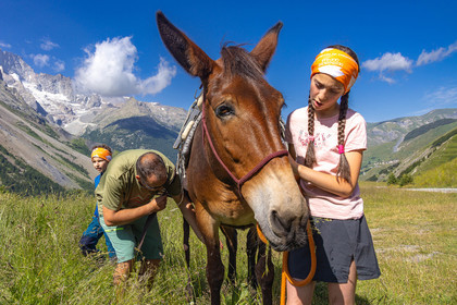 Hautes-Alpes (05), Parc national des Ecrins, vallée de la Romanche, Villar d'Arène, trek accompagné en famille avec animaux de bats face aux glaciers de la Meije // Hautes-Alpes (05), Ecrins National Park, Romanche Valley, Villar d'Arène, accompanied family trek with pack animals facing the Meije glaciers