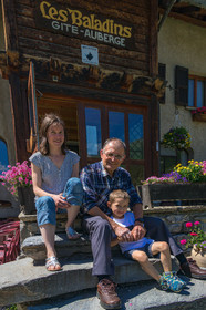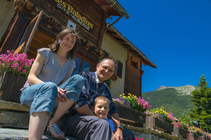 Hautes-Alpes (05), Parc naturel régional du Queyras, Ceillac, Gîte Les Baladins, Marie Fournier avec son fils et son père Jojo/ Hautes-Alpes (05), Queyras Regional Park, Ceillac, Gîte Les Baladins, Marie Fournier