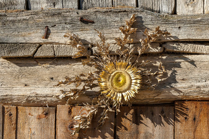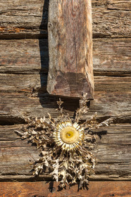 Hautes-Alpes (05), Parc naturel régional du Queyras, Ceillac, facade de maison, carline servant de baromètre // Hautes-Alpes (05), Queyras Regional Park, Ceillac, facade of house, carline serving as barometer