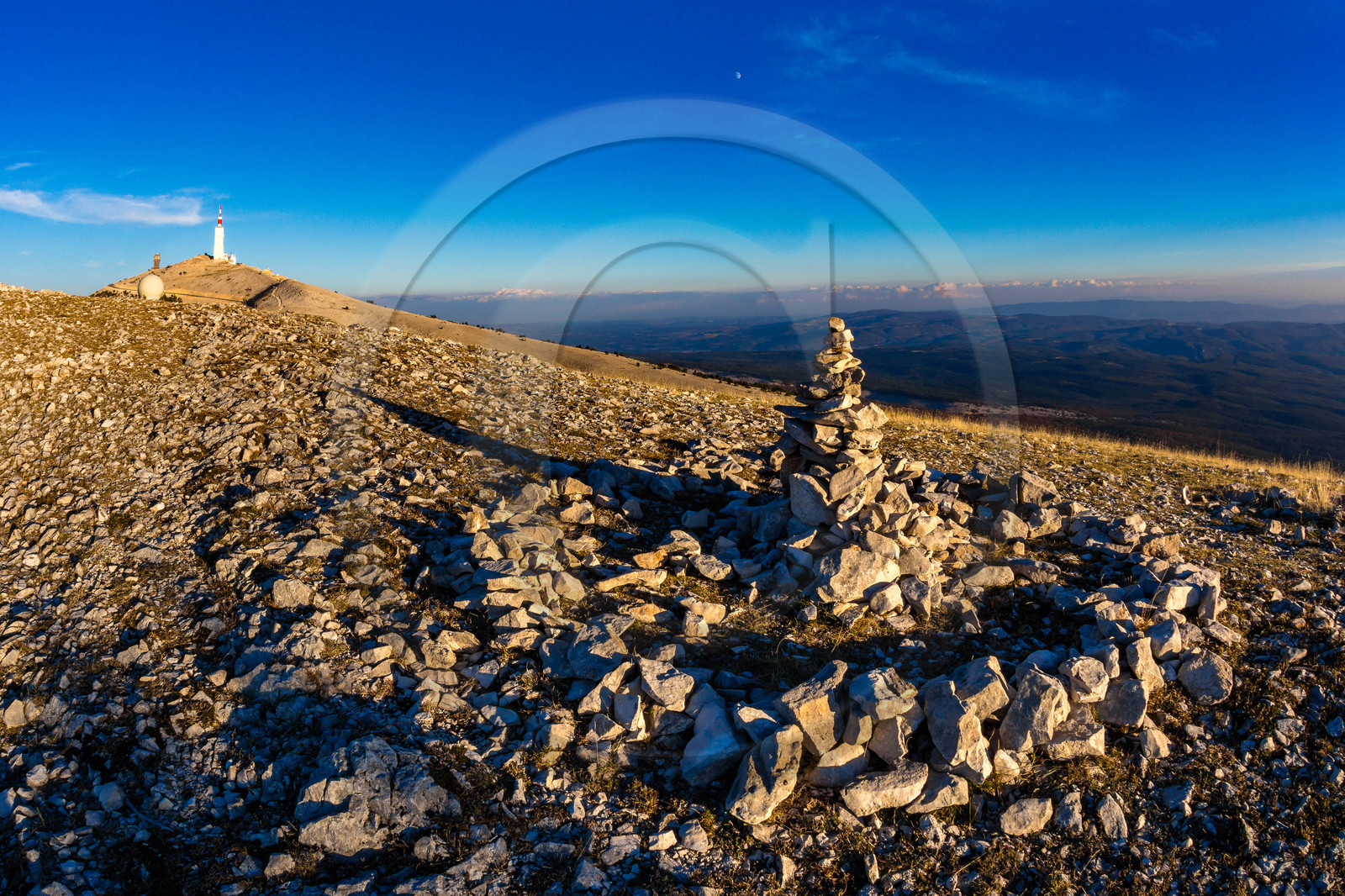 Description | Vaucluse (84) , Mont Ventoux, surnommé le Géant de Provence ou le Mont Chauve, il est classé réserve de biosphère par l'UNESCO et site Natura 2000, cairn |
