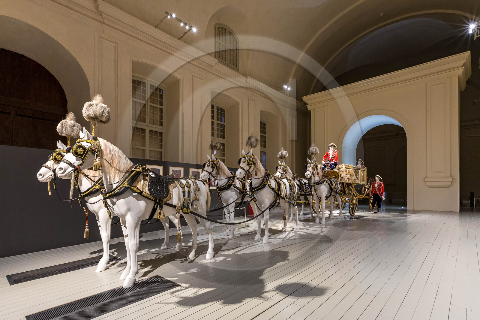 | Description | Italie, Piémont, Turin, La Venaria Reale est classée au Patrimoine mondial de l'Humanité par l'Unesco, Palais royal de Venaria, écuries royales de Juvarra, les Carrosses Royaux, Berline dorée |