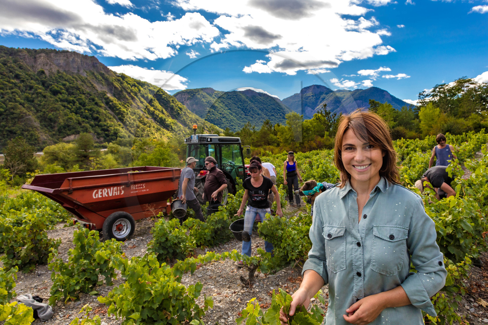 Description | Hautes-Alpes (05), vallée de la Durance, Serre-Ponçon Val d'Avance, Théüs, Vignoble de Théüs, Domaine Allemand, les vendanges |