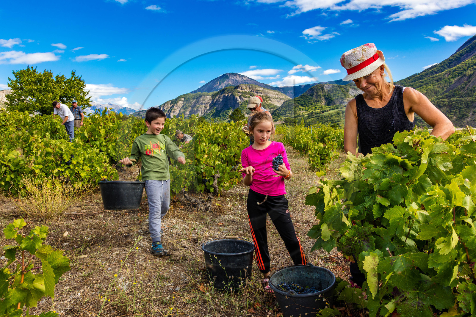 Description | Hautes-Alpes (05), vallée de la Durance, Serre-Ponçon Val d'Avance, Théüs, Vignoble de Théüs, Domaine Allemand, les vendanges |