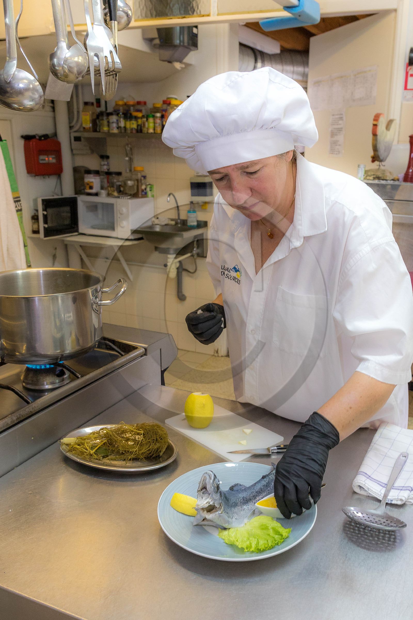 Description | Hautes-Alpes (05), Parc national des Ecrins, Vallée du Valgaudemar, Saint-Maurice-en-Valgaudemar,Hôtel Restaurant Le Val des sources, Colette Gueydan,préparation de la truite bleue |