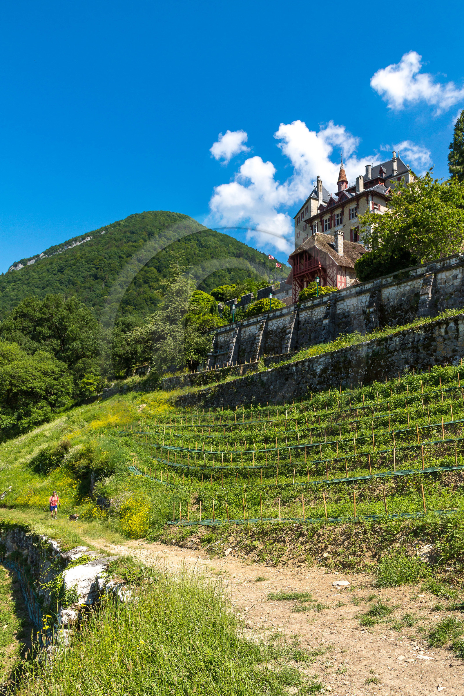 Description | Haute-Savoie (74), Lac d'Annecy, Menthon-Saint-Bernard, Château de Menthon et les vignes |