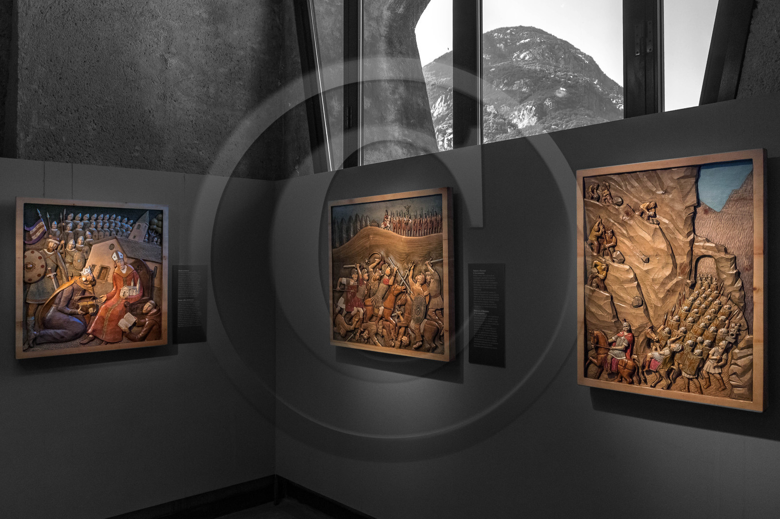 Description | Italie, vallée d'Aoste, Bard, place forte Fort de Bard, Giovanni Thoux, sculpteur, exposition des scènes de vie liée à la tradition valdôtaine |