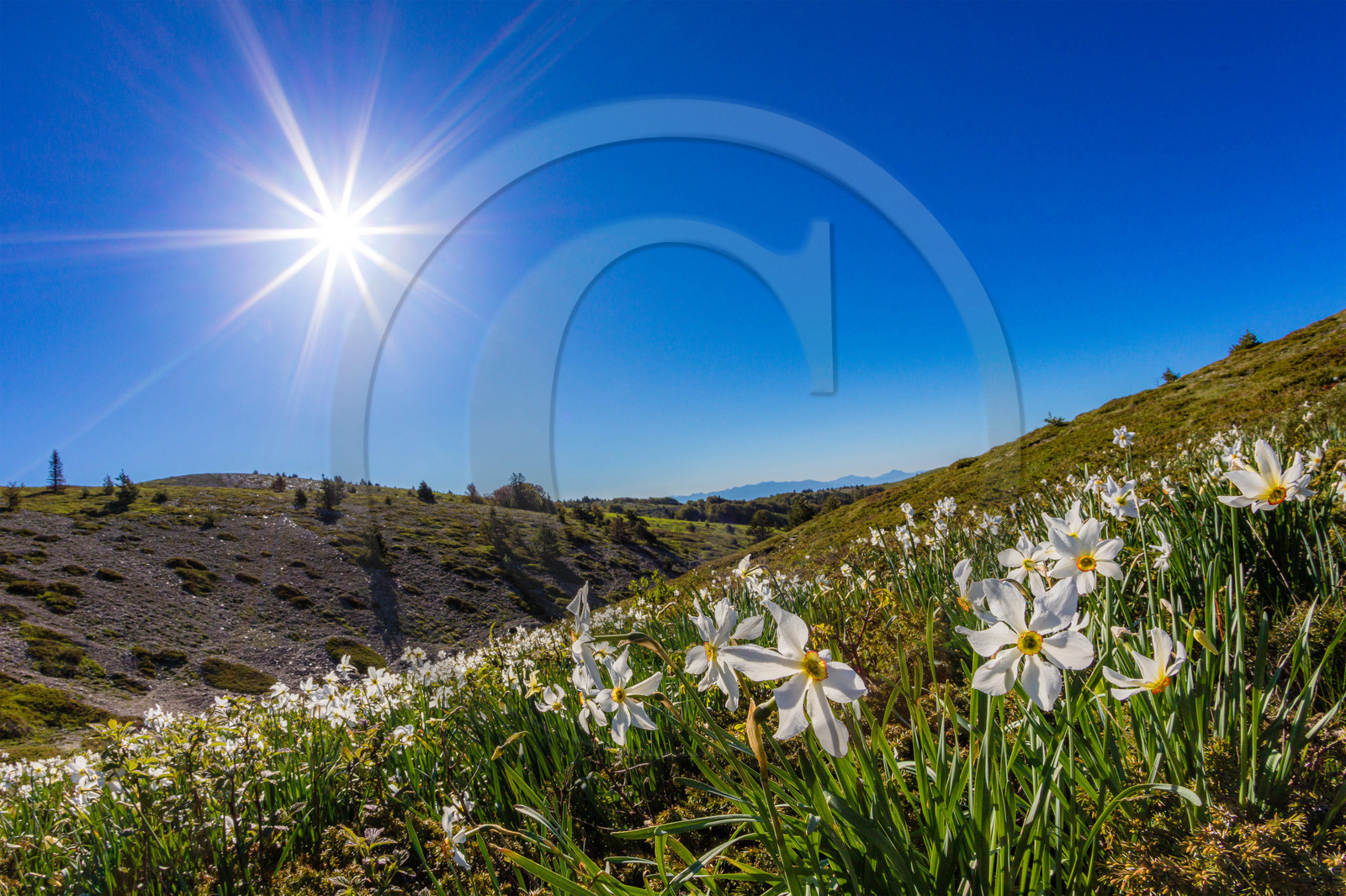 Description | Alpes-de-Haute-Provence (04), Saint-Étienne-les-Orgues, Noyers-sur-Jabron, Montagne de Lure (1 825 m), Espaces naturels sensible et zone Natura 2000, champ de narcisses |