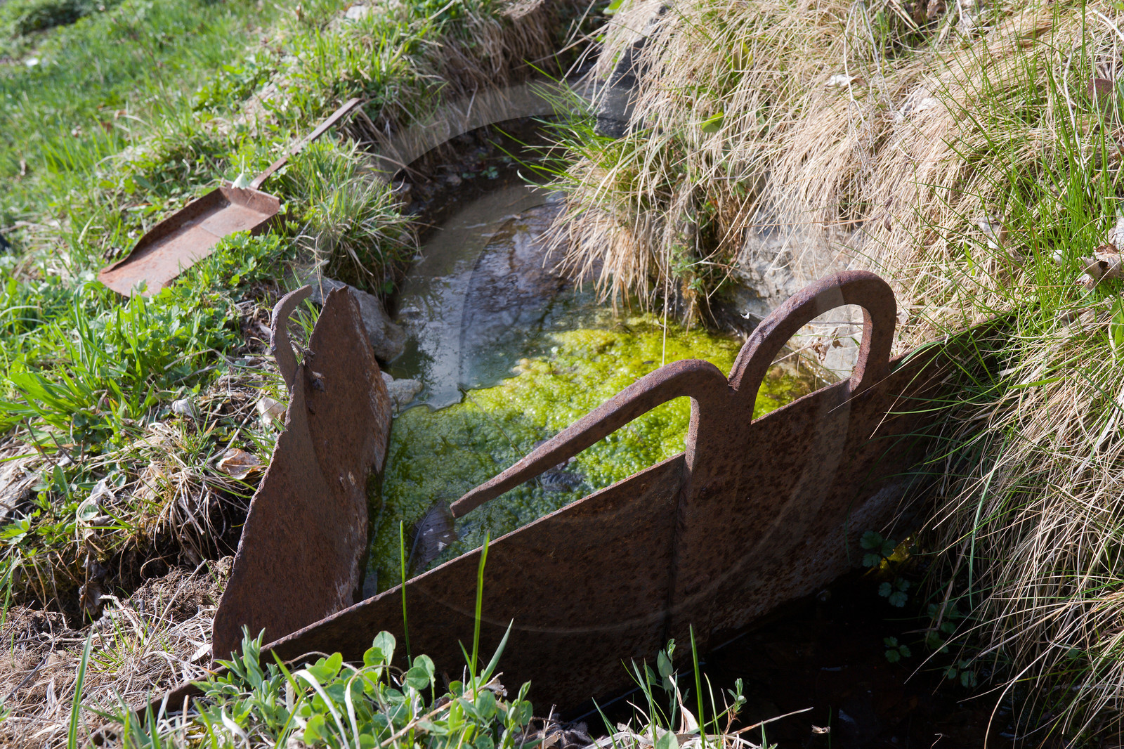 | Description | Hautes-Alpes (05), Guisane, Briançon, réseau des canaux d'irrigation du Briançonnais, canal d'irrigation, Canal Neuf, Rochas Garnier, étanche à poignée et pelle |