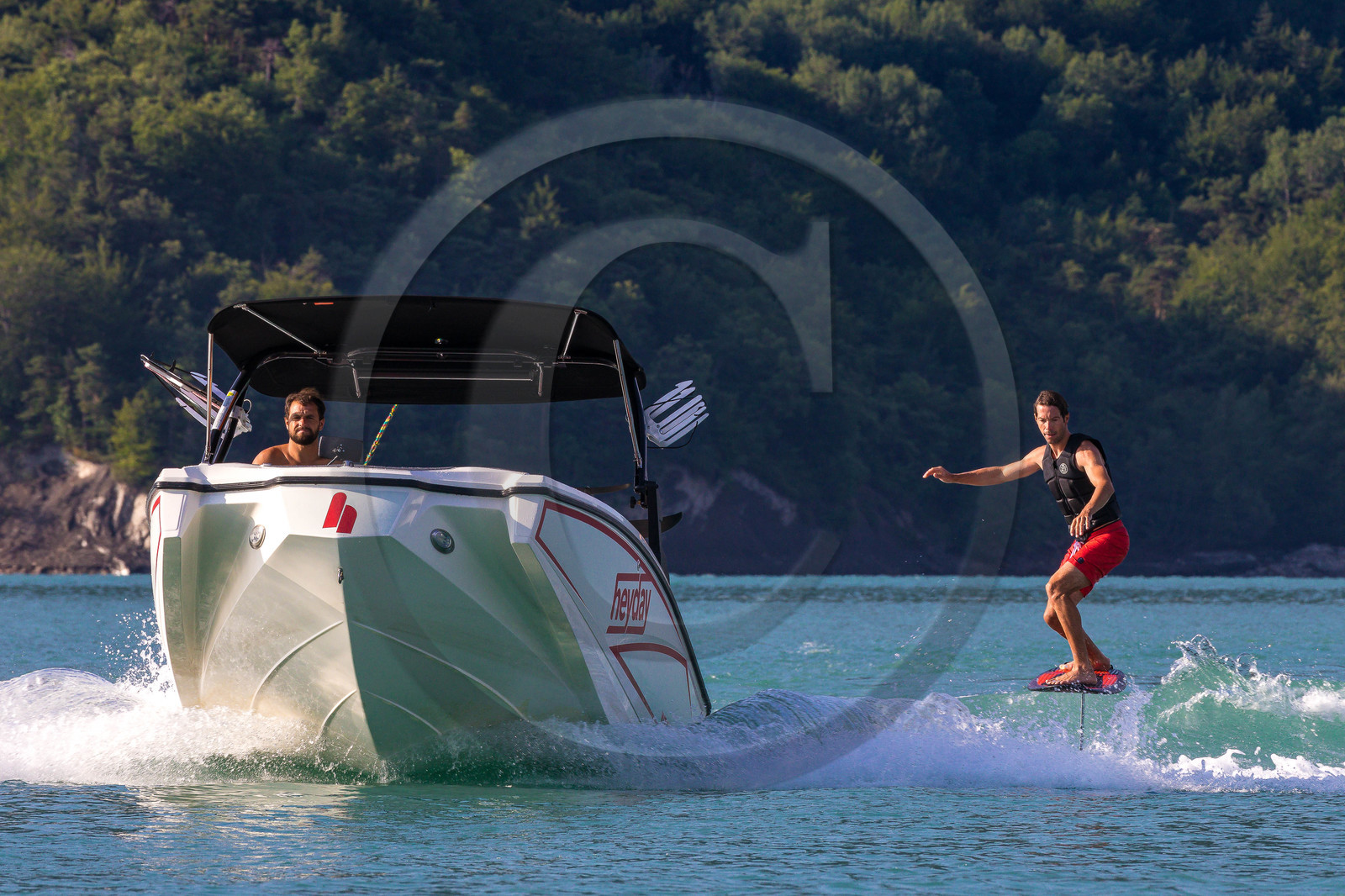 Description | Hautes-Alpes (05), Chorges, lac de Serre-Ponçon, Baie Saint-Michel, activité nautique, Nautic B, Surf Foil |