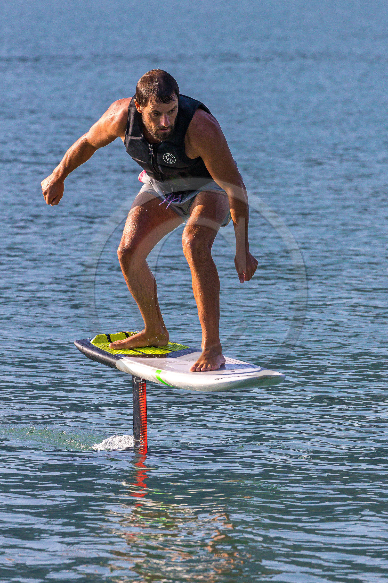 Description | Hautes-Alpes (05), Chorges, lac de Serre-Ponçon, Baie Saint-Michel, activité nautique, Nautic B, Surf Foil |
