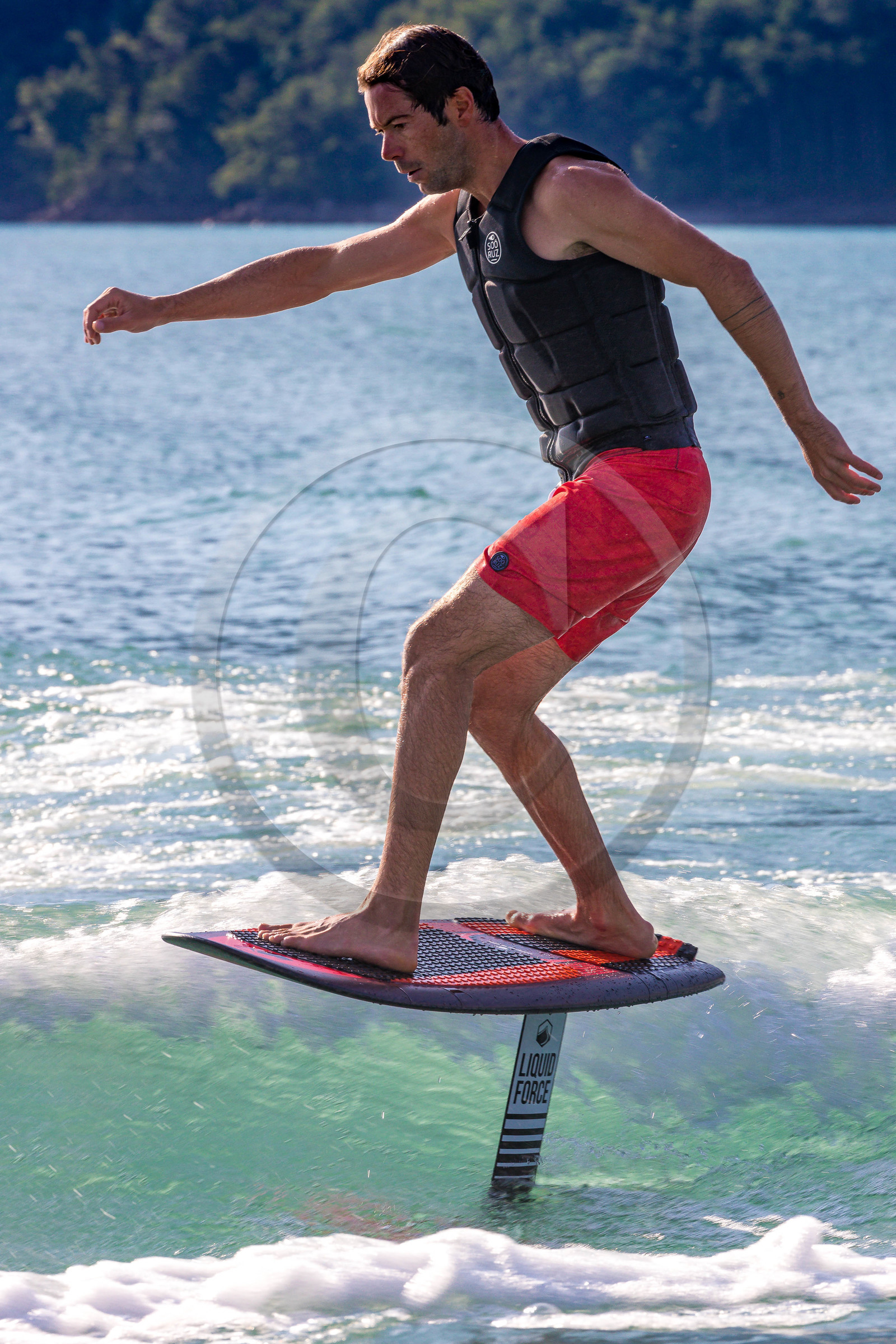 Description | Hautes-Alpes (05), Chorges, lac de Serre-Ponçon, Baie Saint-Michel, activité nautique, Nautic B, Surf Foil |