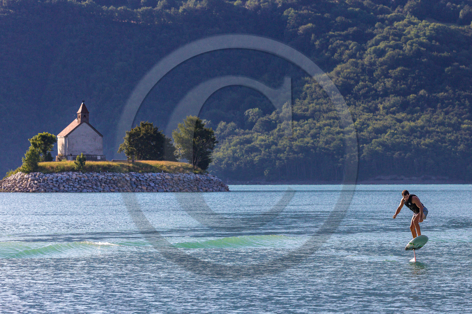 Description | Hautes-Alpes (05), Chorges, Serre-Ponçon lake, Baie Saint-Michel, nautical activity, Surf Foil |