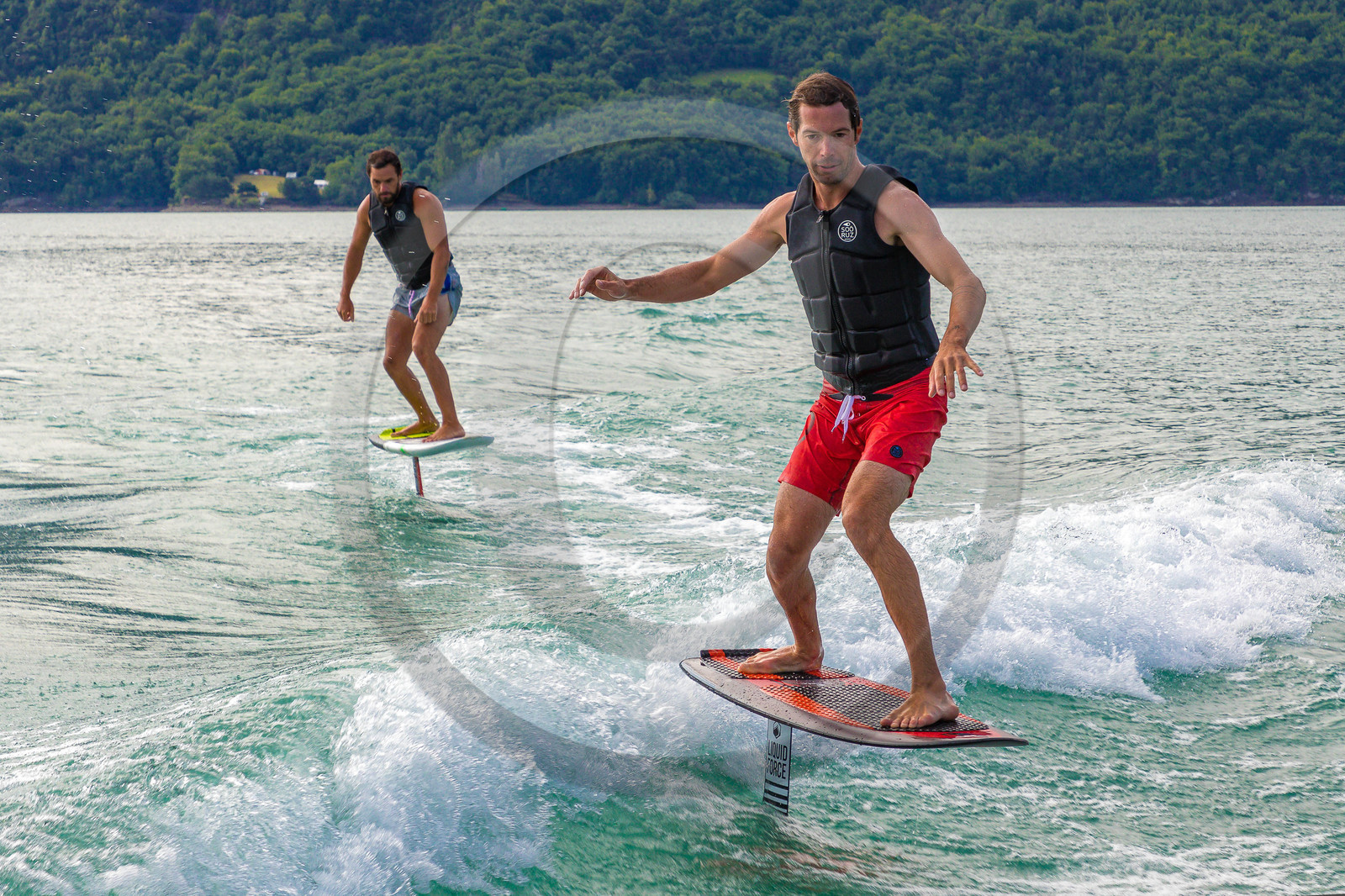 Description | Hautes-Alpes (05), Chorges, lac de Serre-Ponçon, Baie Saint-Michel, activité nautique, Nautic B, Surf Foil |