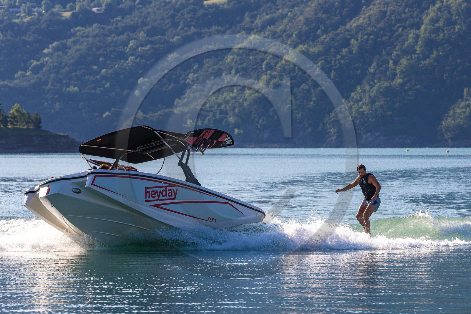 Description | Hautes-Alpes (05), Chorges, lac de Serre-Ponçon, Baie Saint-Michel, activité nautique, Nautic B, Surf Foil |