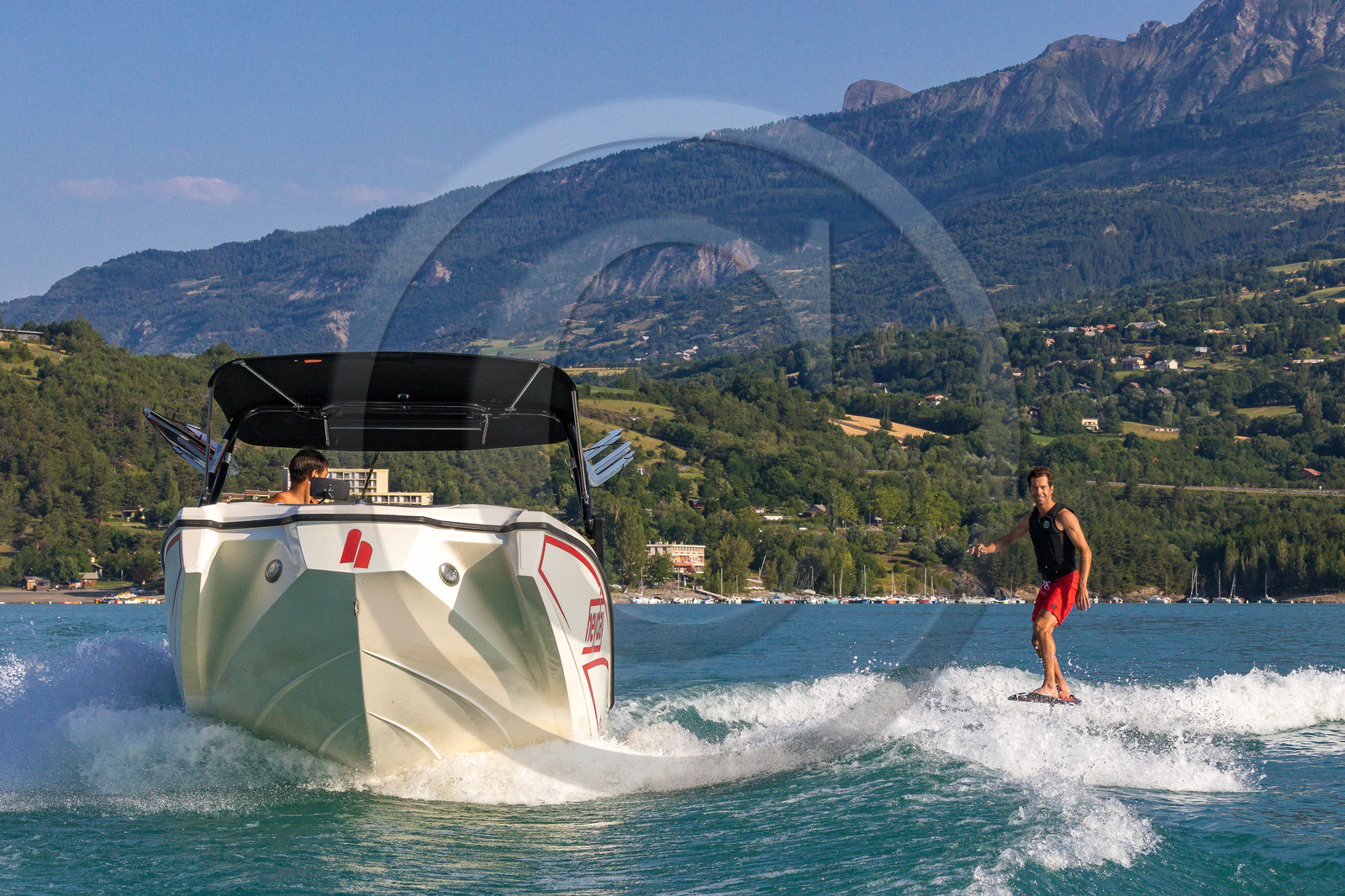 Description | Hautes-Alpes (05), Chorges, lac de Serre-Ponçon, Baie Saint-Michel, activité nautique, Nautic B, Surf Foil |