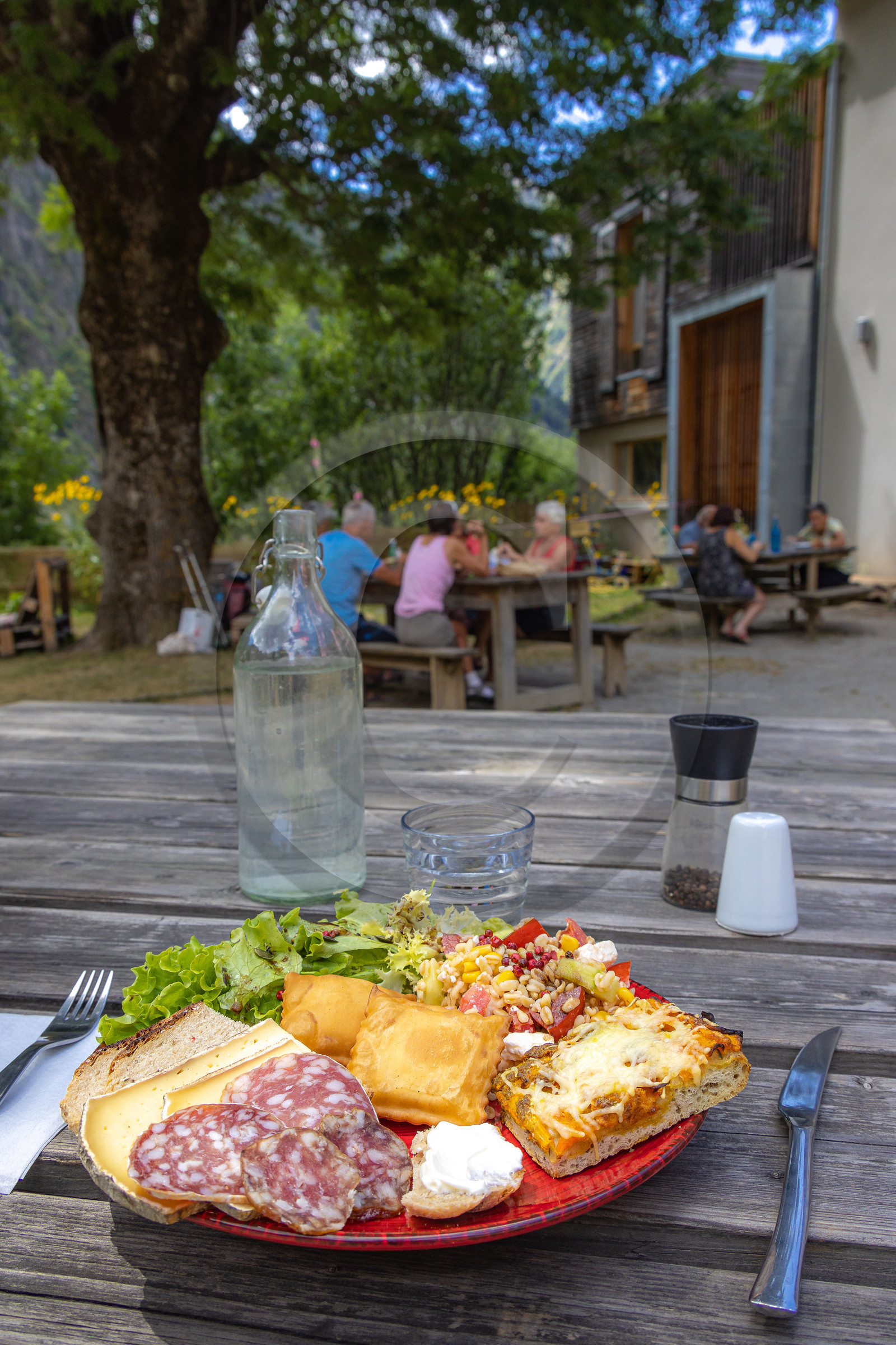 Description | Isère (38), Valbonnais, commune de Valjouffrey, Parc national des Ecrins, Vallée de la Bonne, Le Désert en Valjouffrey, Gîte d'étape Les Arias, l'assiète du randonneur |