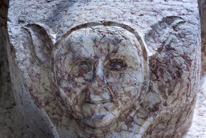 Hautes-Alpes (05), Vallouise, Les Vigneaux, Église Saint-Laurent classée monument historique, détail sculpture des colonnes en pierre avec des chapiteaux sculptés // Hautes-Alpes (05), Vallouise, Les Vigneaux, Église Saint-Laurent des Vigneaux