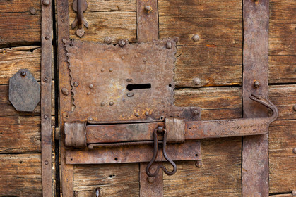 Hautes-Alpes (05), Vallouise, Les Vigneaux, Église Saint-Laurent classée monument historique, porte et vantaux, serrure en fer forgé, verrou terminé par une tête de chimère // Hautes-Alpes (05), Vallouise, Les Vigneaux, Église Saint-Laurent des Vigneaux